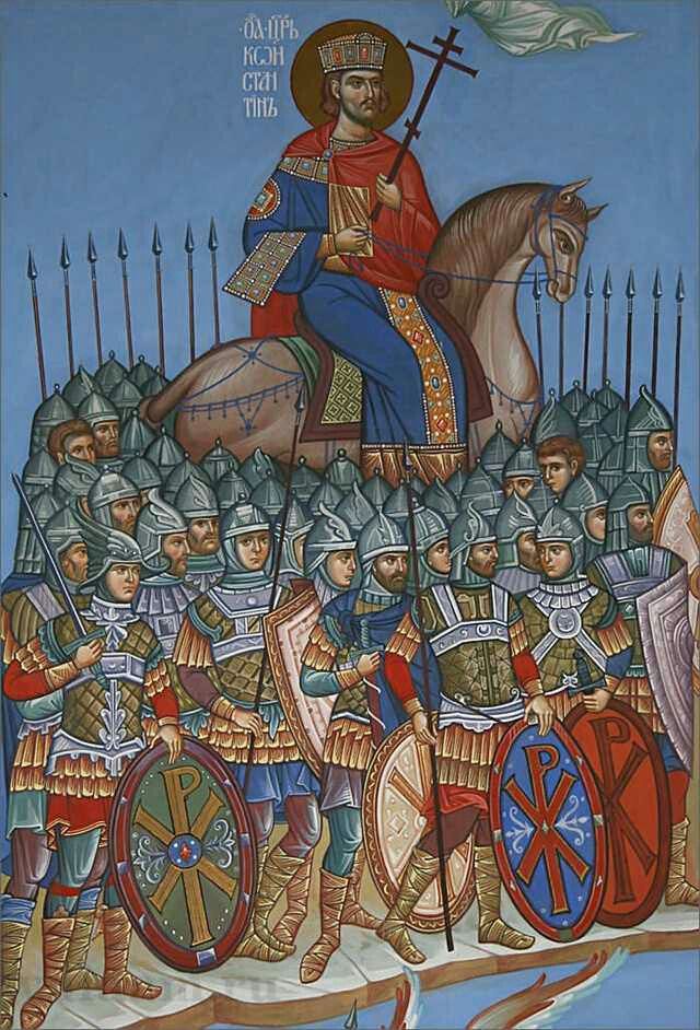 The chrism also has an imperial history: Emperor Constantine, after having a vision of the chrism accompanied by the words "By this sign you will conquer" (Ἐν τούτῳ νίκα), is said to have placed it on the shields of his soldiers. This victory at the Battle of the Milvian Bridge (312) marks one of the major turning points in Christian history.