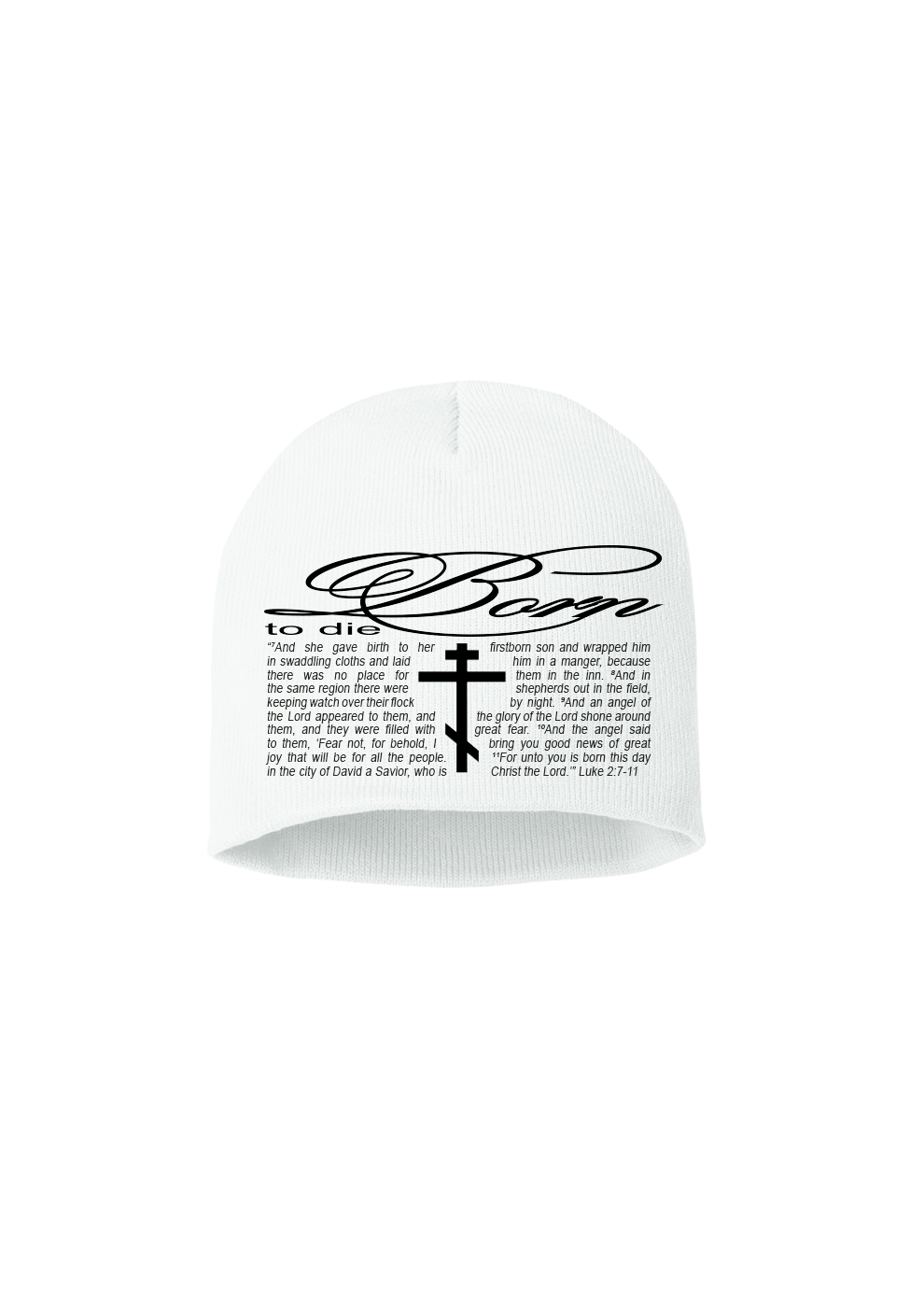 White Born To Die beanie, featuring an Orthodox cross and the passage from Luke 2:7–11 recalling the birth of Christ.