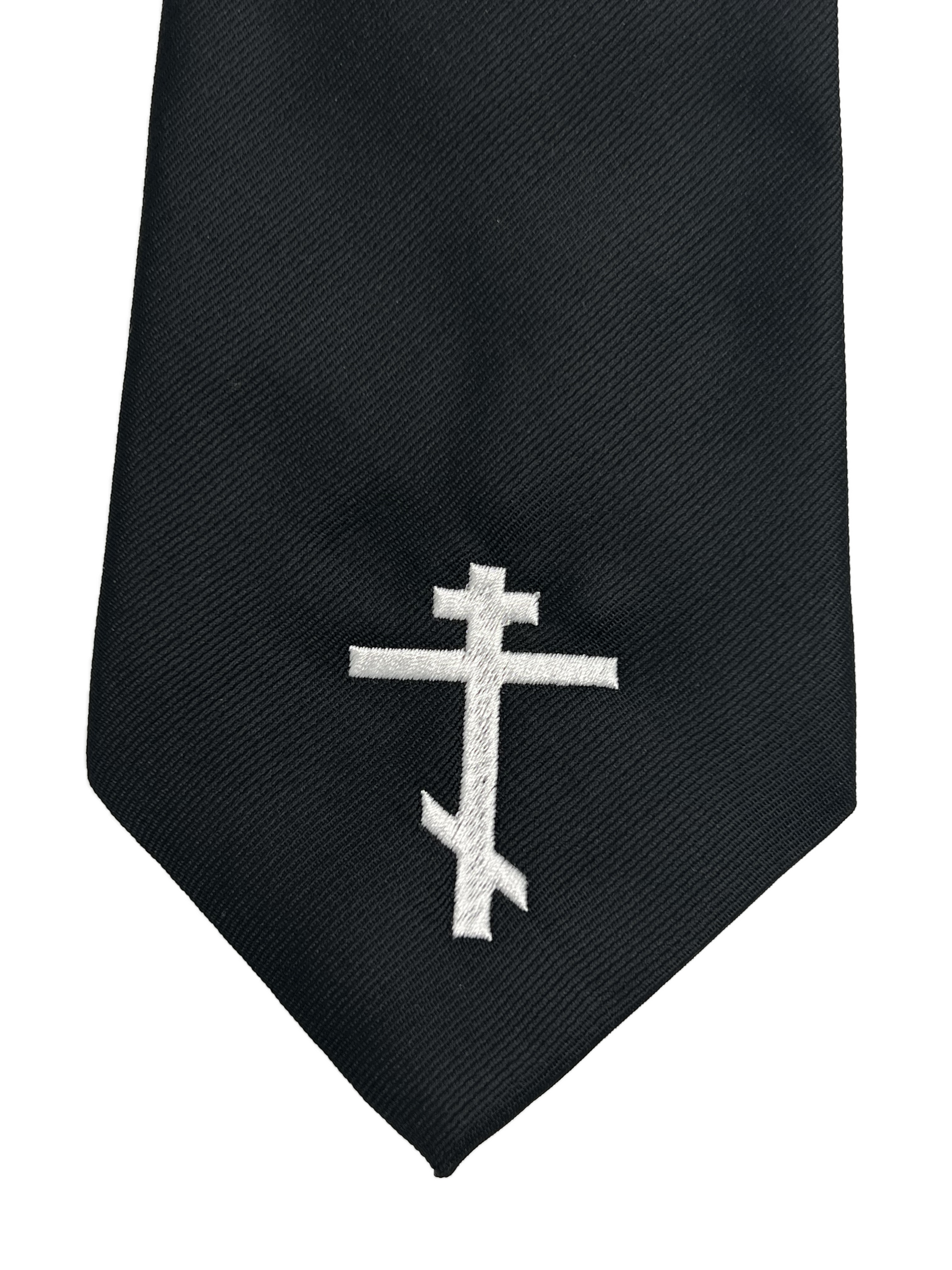 Black clip-on tie embroidered with the Orthodox cross near the tip.