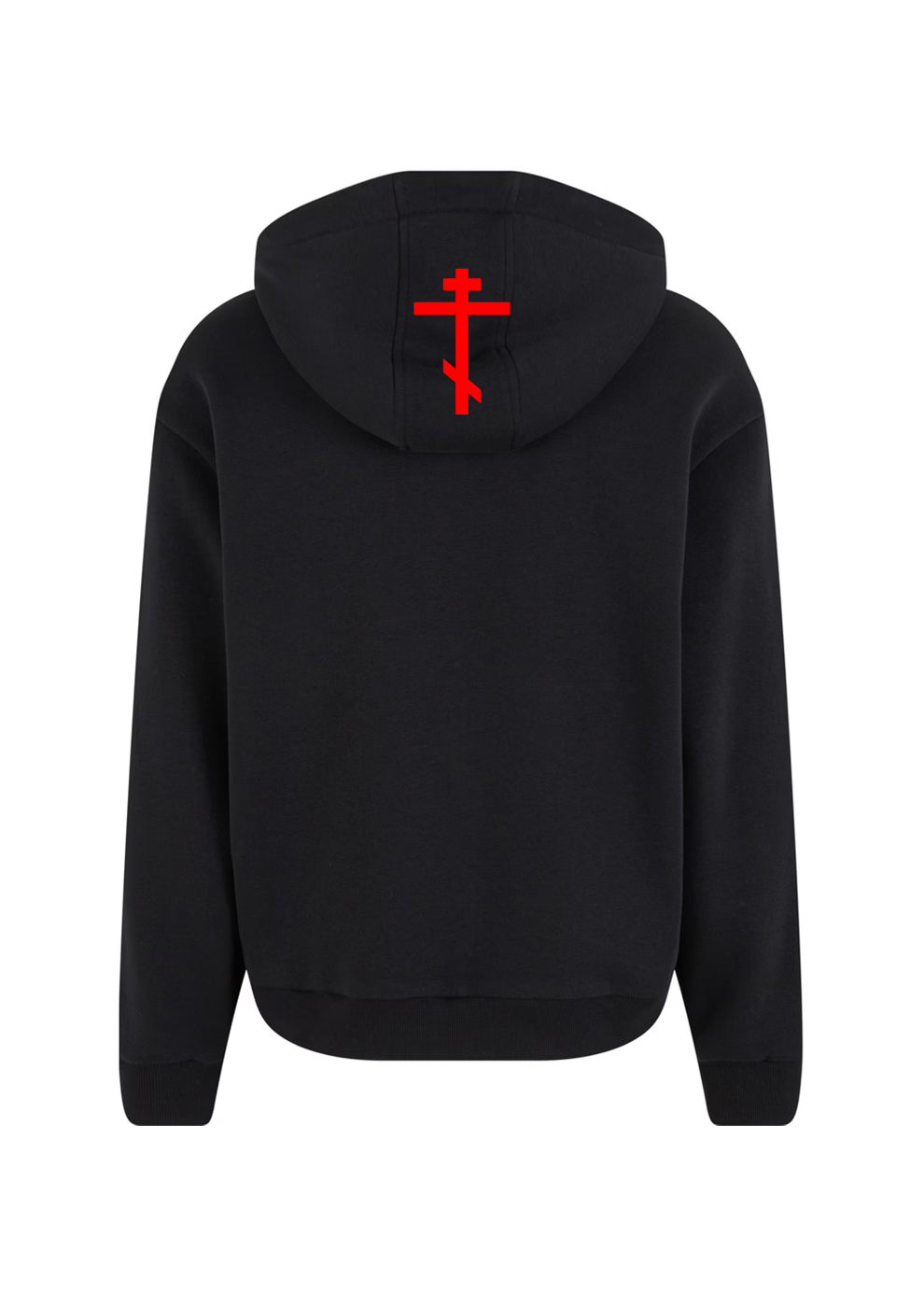 Oversized black hoodie featuring the sacred inscription IC XC NIKA — “Jesus Christ conquers,” a Greek abbreviation found on Orthodox crosses and Eucharistic breads.