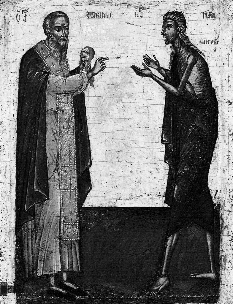 Le jour venu, Zosime se rend au lieu convenu et voit Marie traverser le Jourdain en marchant sur les eaux pour le rejoindre. Après avoir reçu la communion, elle lui demande de se retrouver l’année suivante à l’endroit de leur première rencontre. Lorsque Zosime revient l’année suivante, il découvre le corps sans vie de Marie, étendu à terre, les bras croisés et le visage tourné vers l’orient. Près de sa tête, une inscription indique qu’elle est décédée le soir même où elle a reçu la communion l’année précédente. Zosime, ne pouvant creuser seul sa tombe, voit un lion apparaître et l’aider à creuser la fosse pour l’inhumer.