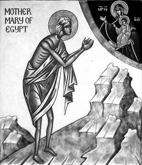 Vers la fin de sa vie, alors qu’elle a passé quarante-sept ans dans le désert, Marie croise le chemin du moine Zosime de Palestine. Ce dernier, réputé pour sa piété, s’était retiré dans le désert pendant le Carême pour jeûner et méditer. Lorsqu’il aperçoit Marie, il est d’abord surpris par son apparence : une femme nue, au corps marqué par les rigueurs du désert, avec des cheveux blancs tombant sur ses épaules. Par respect, il lui tend son manteau pour qu’elle se couvre. Marie lui raconte alors son histoire, confessant son passé de pécheresse et décrivant sa vie d’ascèse. Touché par son récit et reconnaissant sa sainteté, Zosime lui administre la sainte communion. Ils conviennent de se revoir l’année suivante au même endroit.