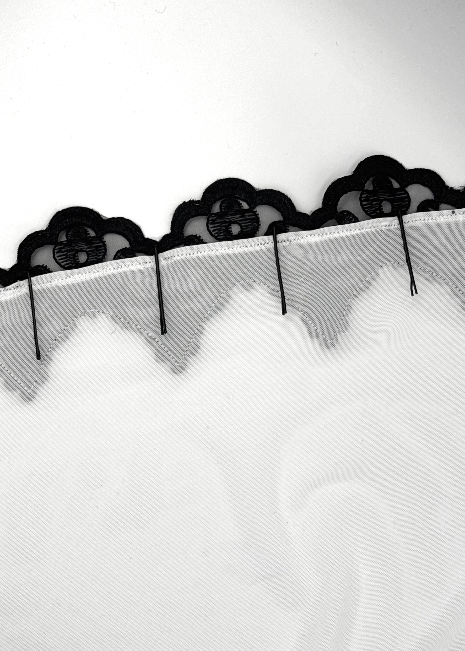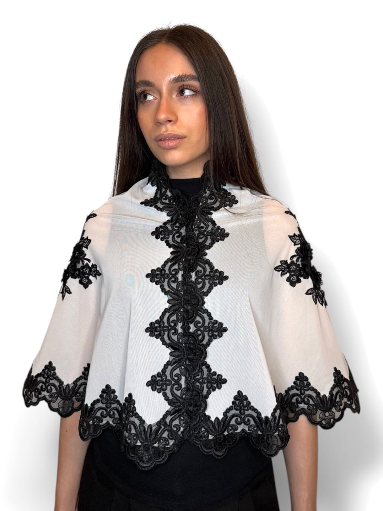 Un voile conçu dans un mesh de qualité, léger et fluide, associé à une dentelle épaisse et des roses noires brodées. Au dos, une croix orthodoxe imprimée en mousse de velours.